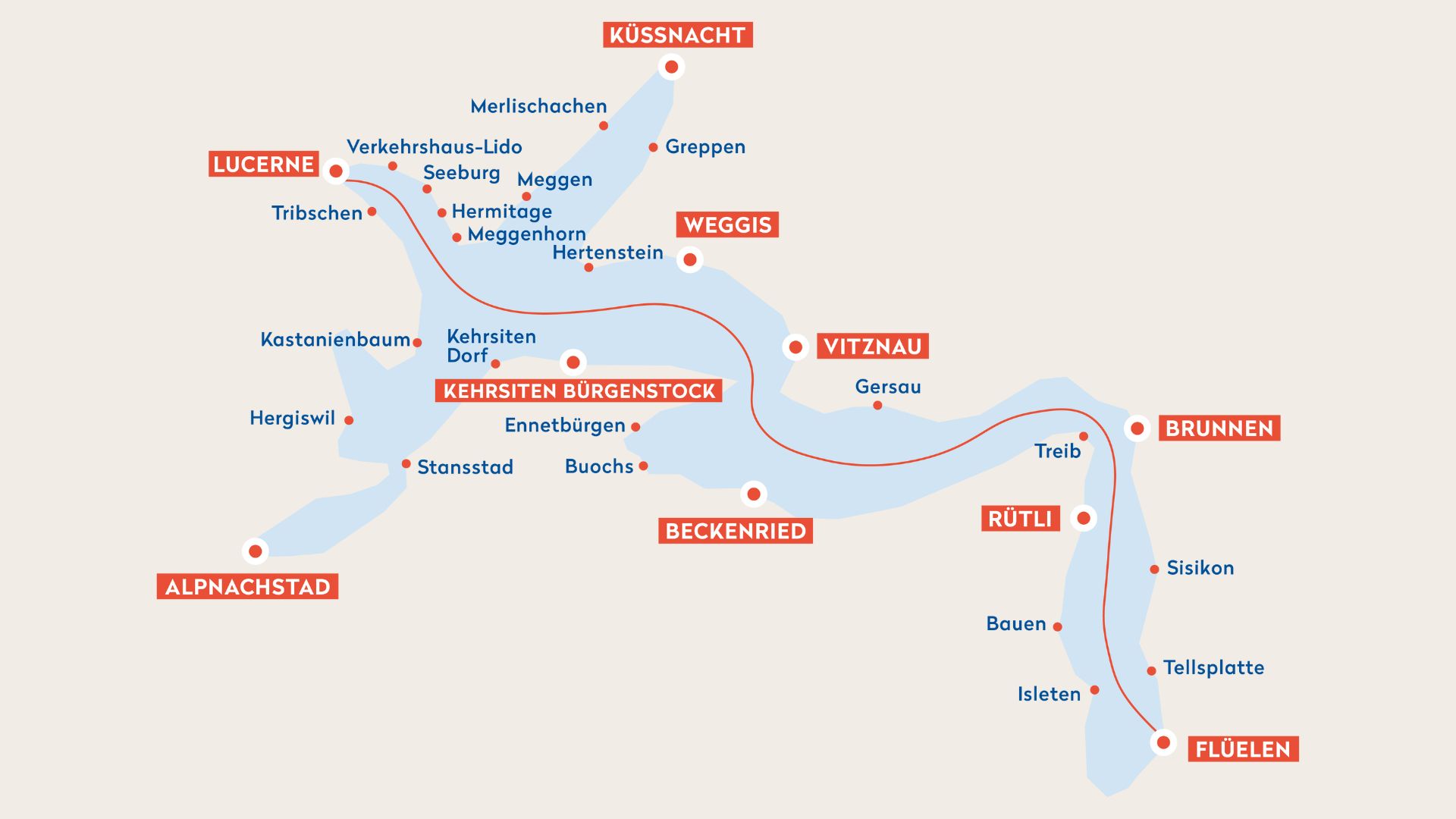 Übersichtskarte der Streckführung des Gotthard Panorama Express mit der Strecke des Dampfschiffes auf dem Vierwaldstättersee.